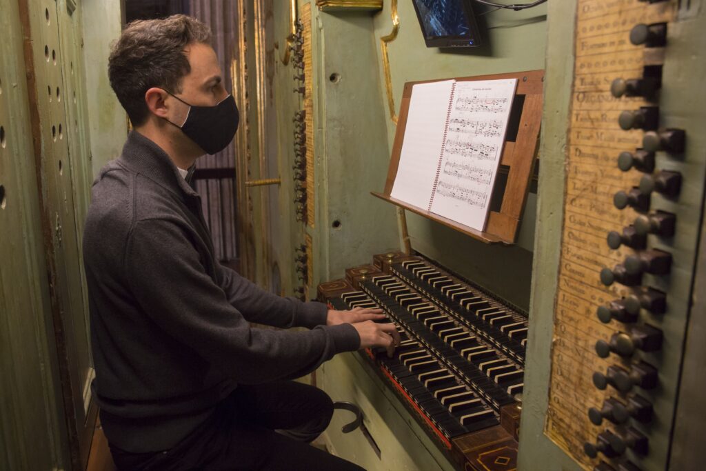 Tocando uno de los órganos barrocos de la Catedral